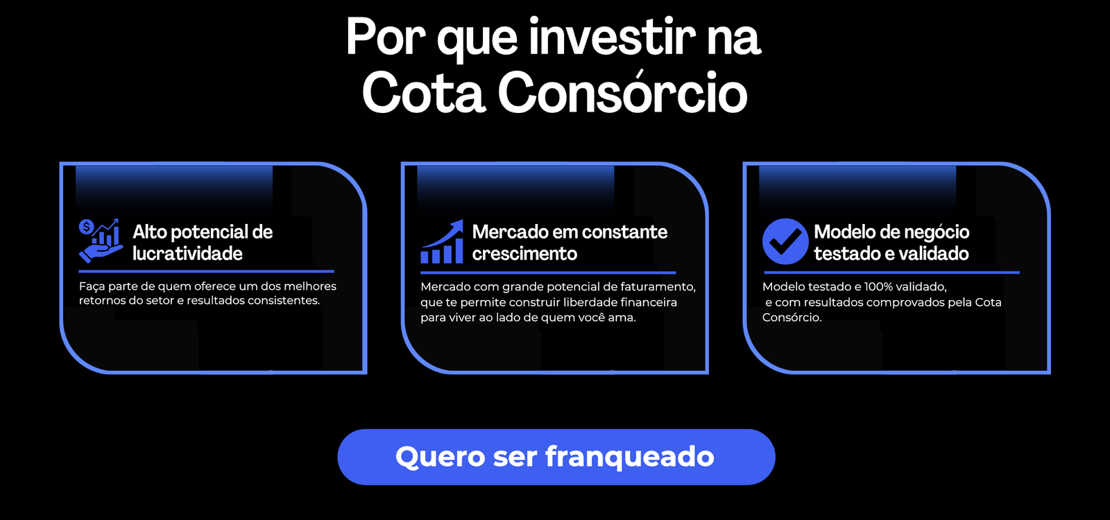 Sim. A Cota Consórcio oferece suporte na escolha do ponto comercial. Ajudamos o franqueado a identificar a melhor opção para o perfil dele, orientando sobre localização, estrutura e adequação do espaço. Nosso objetivo é garantir que ele tenha um ambiente que realmente atenda às necessidades do negócio e favoreça seus resultados